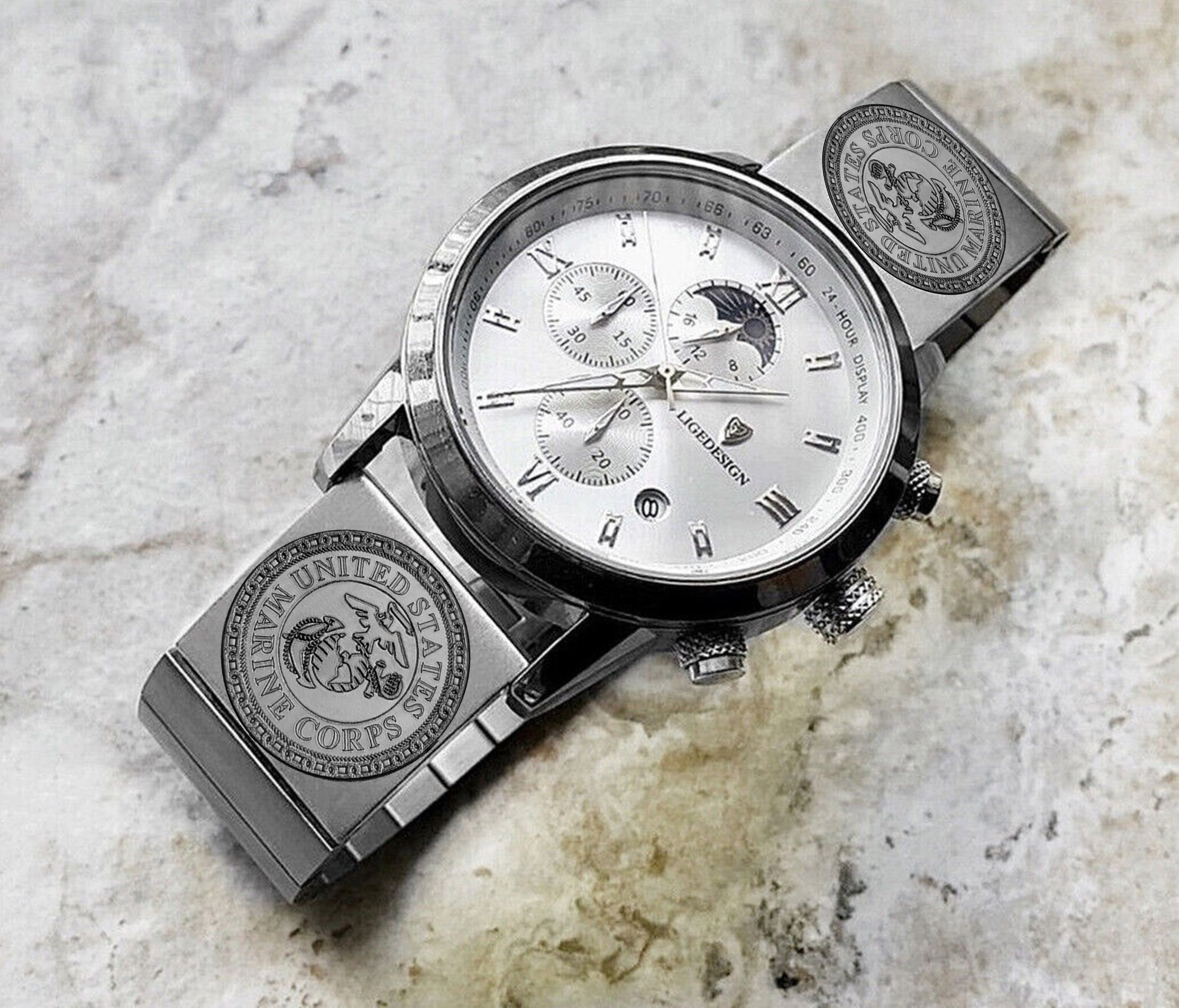 Marine Corps Engraved Watch Band for 22mm 24mm 25mm Lugs Traditional Casual Luxury and Smartwatches Silver Color Stainless Steel Bracelet Strap MC1