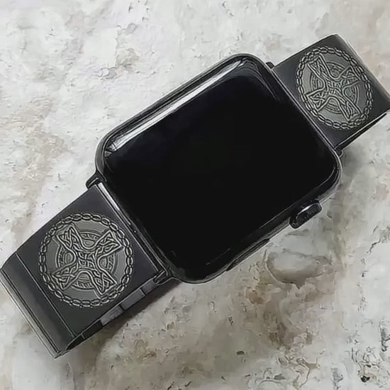 Celtic Cross Engraved Watch Band Compatible with Apple iWatch Ultra 2 9 8 7 SE 6 5 4 3 2 1 Case 38mm 40mm 41mm 42mm 44mm 45mm 49mm Black Stainless Steel CC2