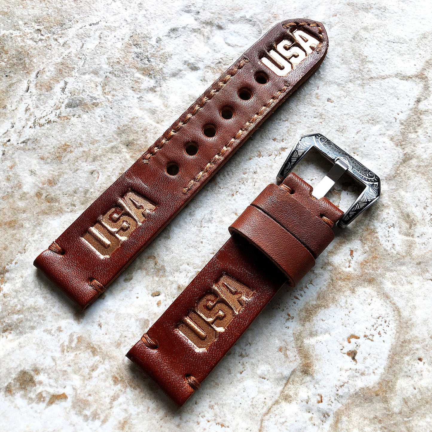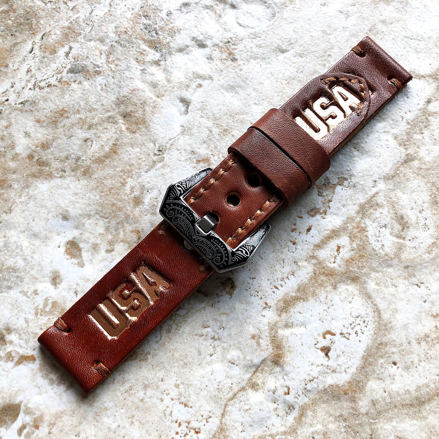 USA Band 22mm 24mm 25mm Compatible with Apple Watch Fitbit Versa 2 3 4 Sense 2 Ionic Accented Embossed Tooled Real Leather Handmade Strap
